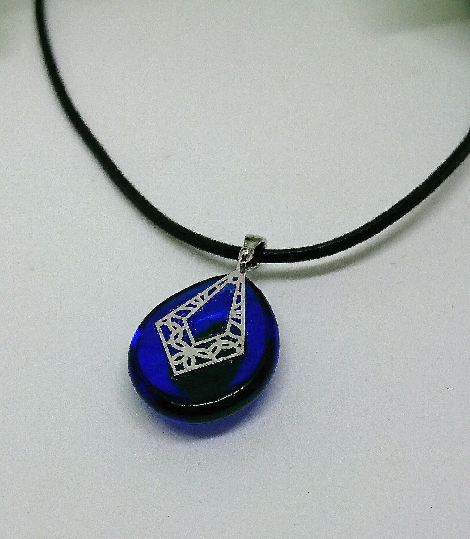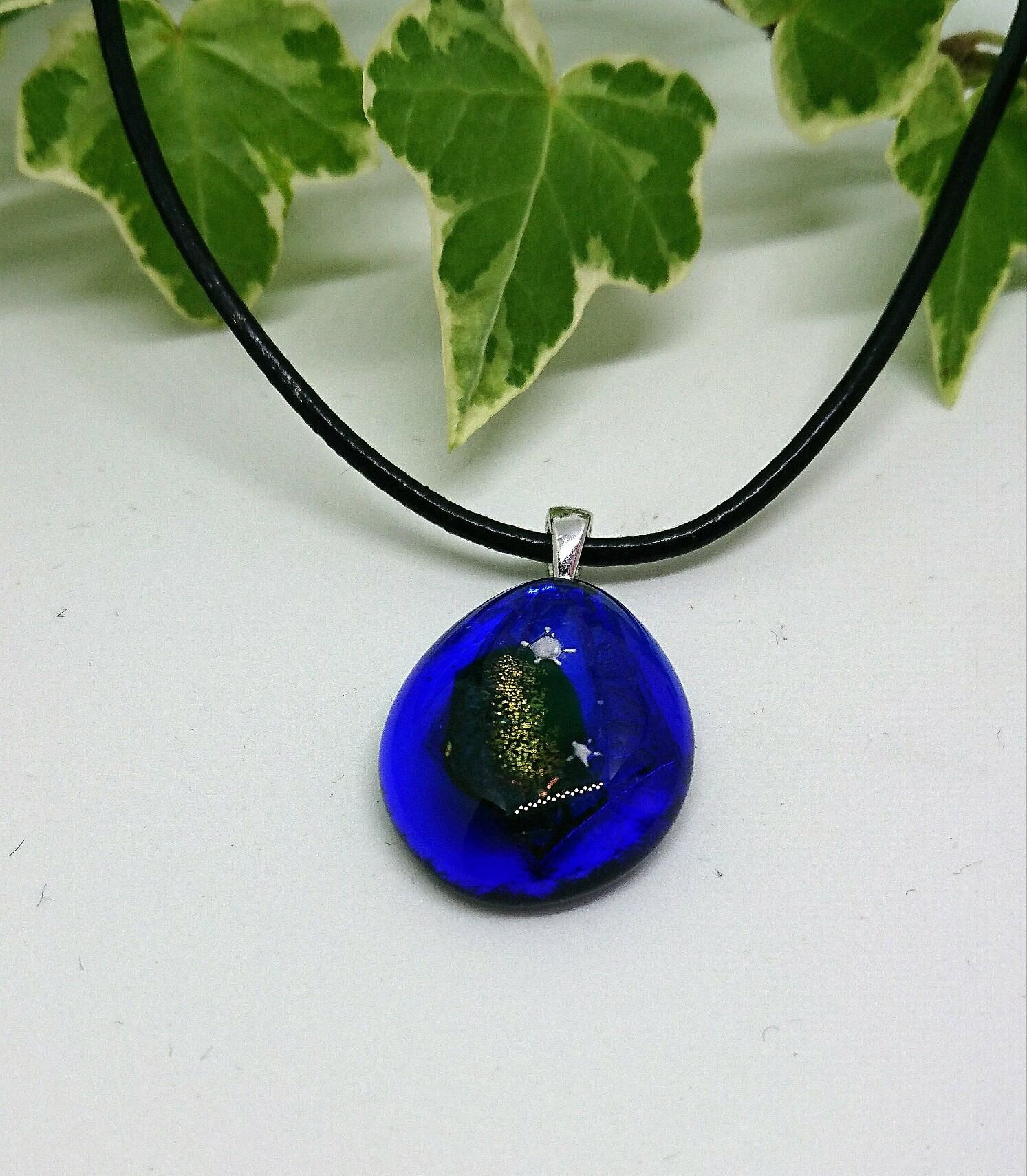 ロイヤルブルーの透明ガラスに、グリーン系の透明ガラスと光で色が変化するダイクロガラスを重ね合わせ、大小2つの星の砂を透明ガラスで挟んで焼いたネックレスです。
