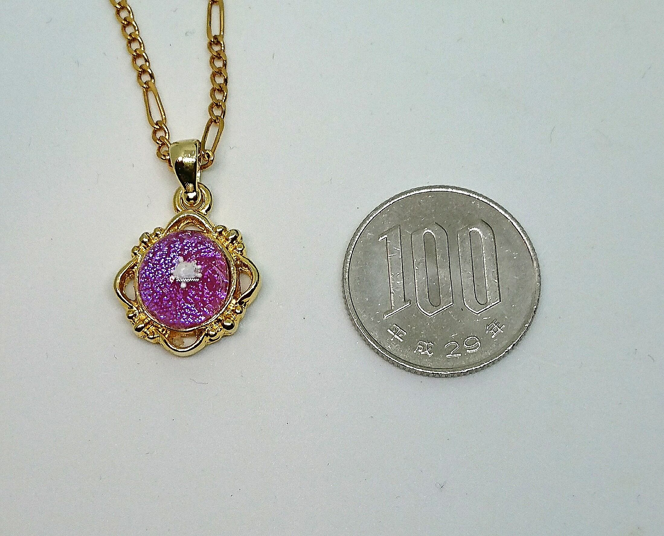 光で色が変化するピンクダイクロガラスに星の砂を透明ガラスで挟んで焼いネックレスです。