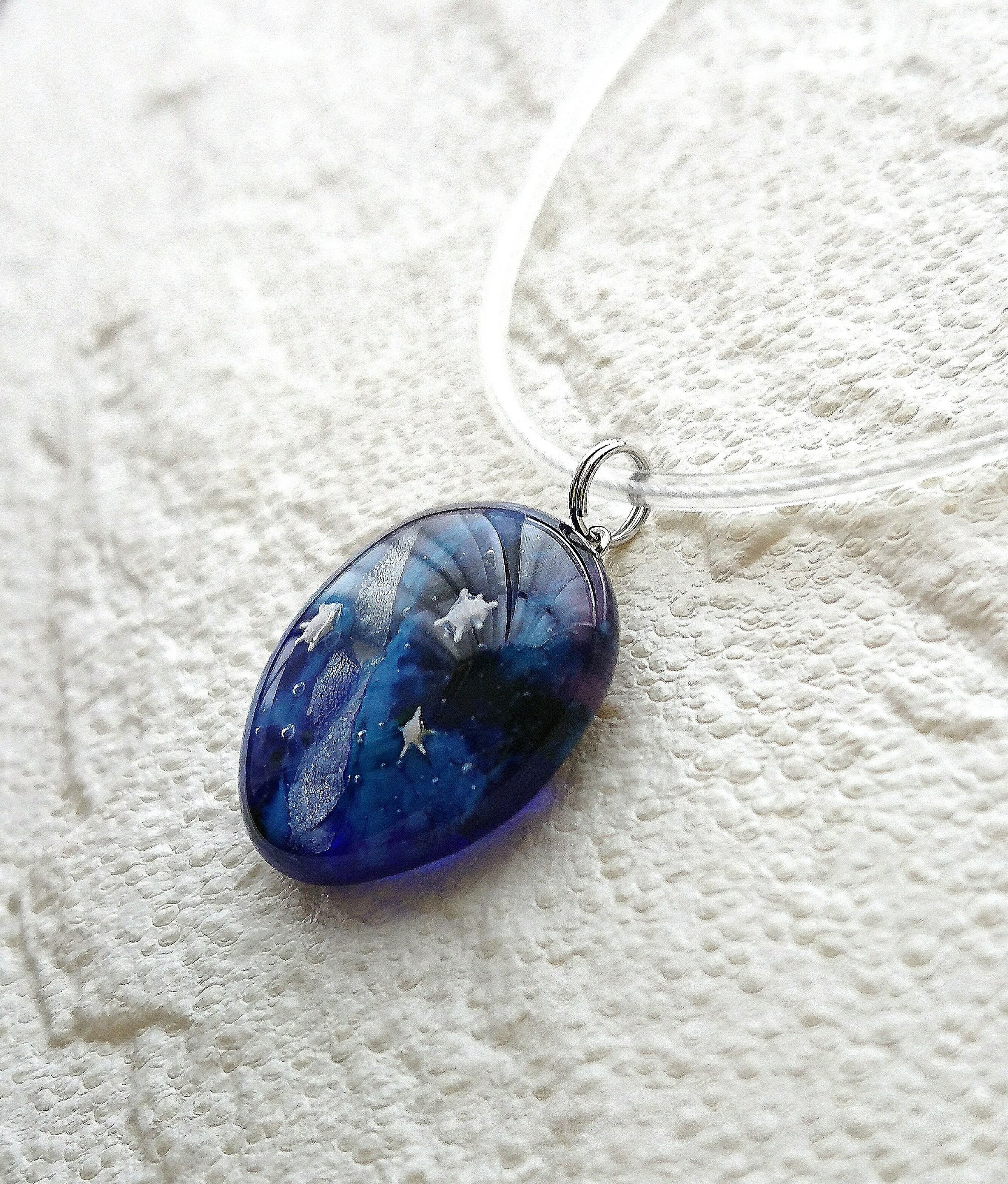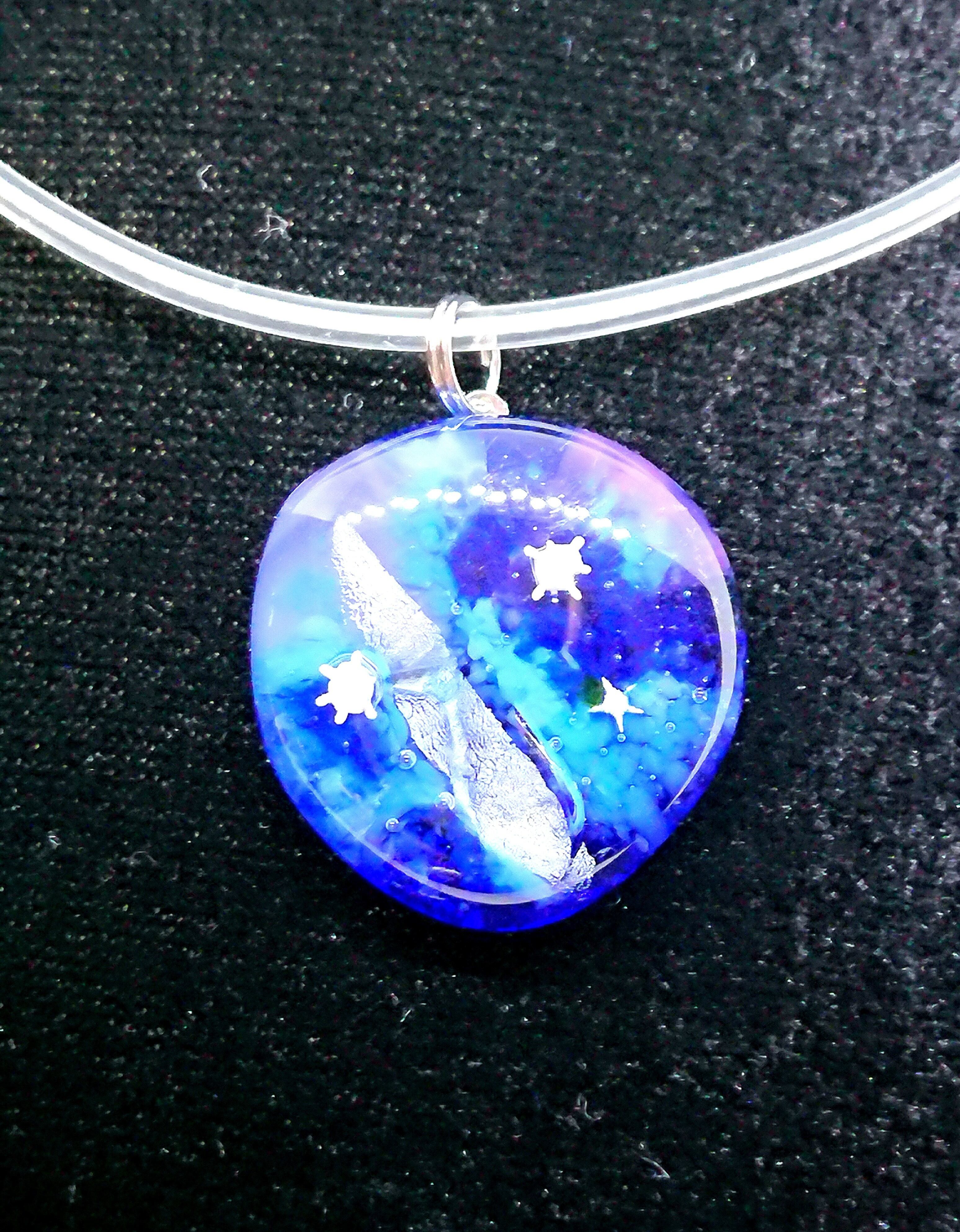 ブルー、パープル系のガラス板を重ね合わせブルー系ガラス粒をミックスし、星の砂を3つ透明ガラスに挟んで焼いたネックレスです。