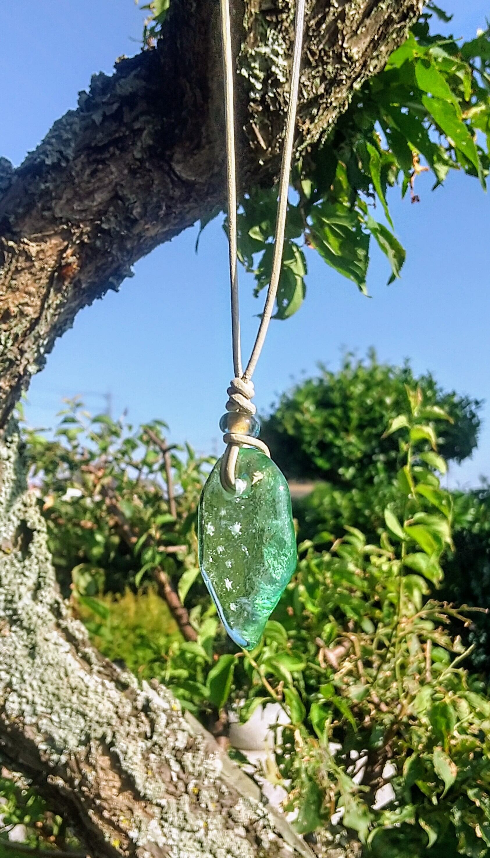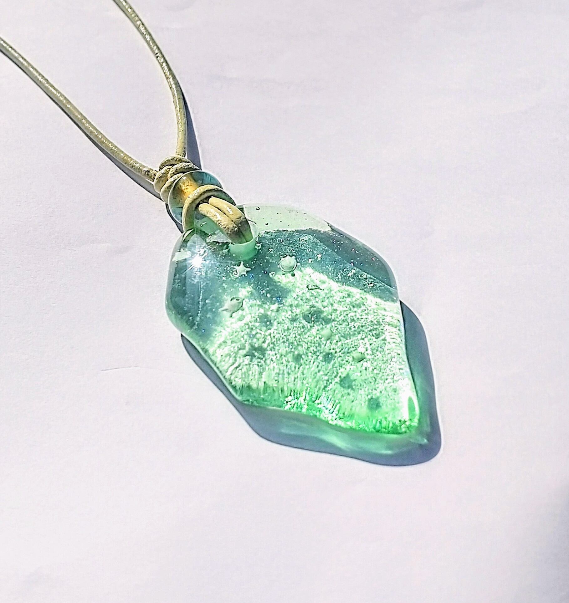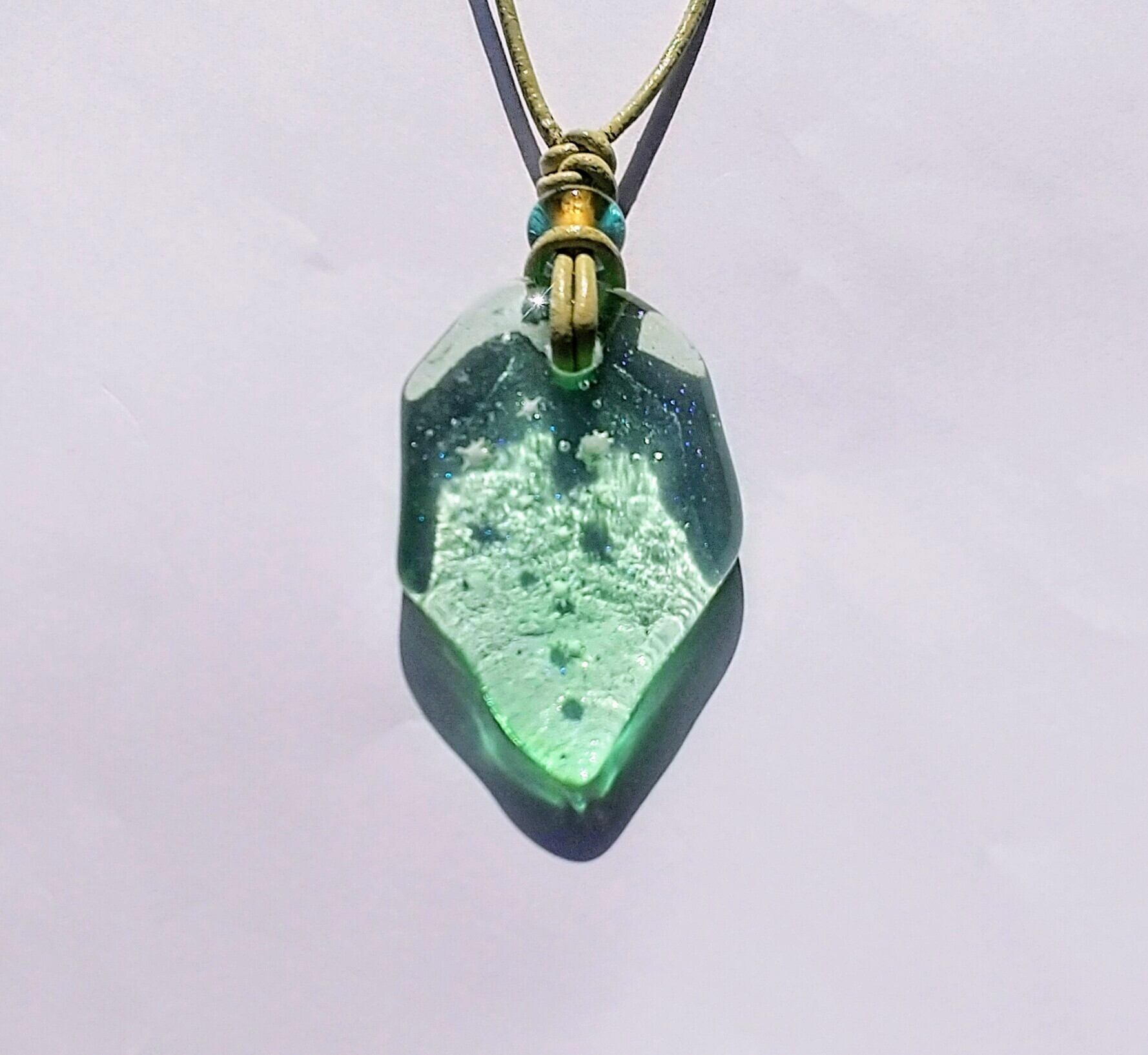 淡いライトグリーンのガラスに、ブルー系ダイクロガラス(光で色が変化する)を重ね、星の砂を北斗七星の形に置いて、透明ガラスを重ねて焼きあげました。